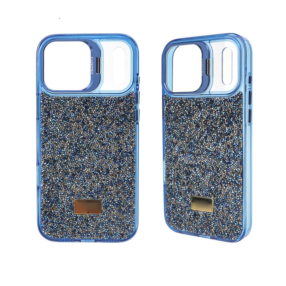 Funda para teléfono de TPU con cobertura total, incrustaciones de diamantes y soporte metálico para la lente.