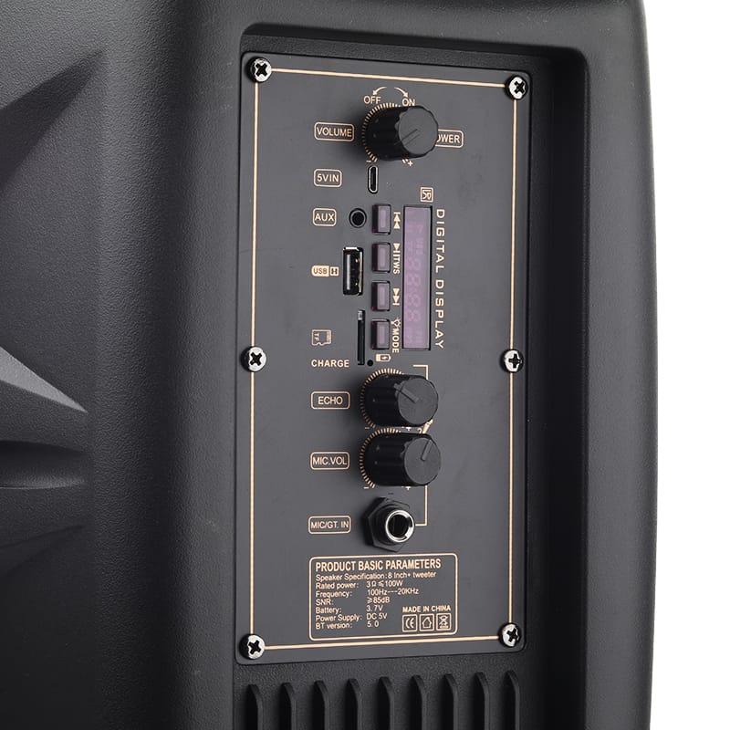 • Función:BT/USB/FM /AUX/Tres mandos /Karaoke/Luz LED/Pantalla/TWS